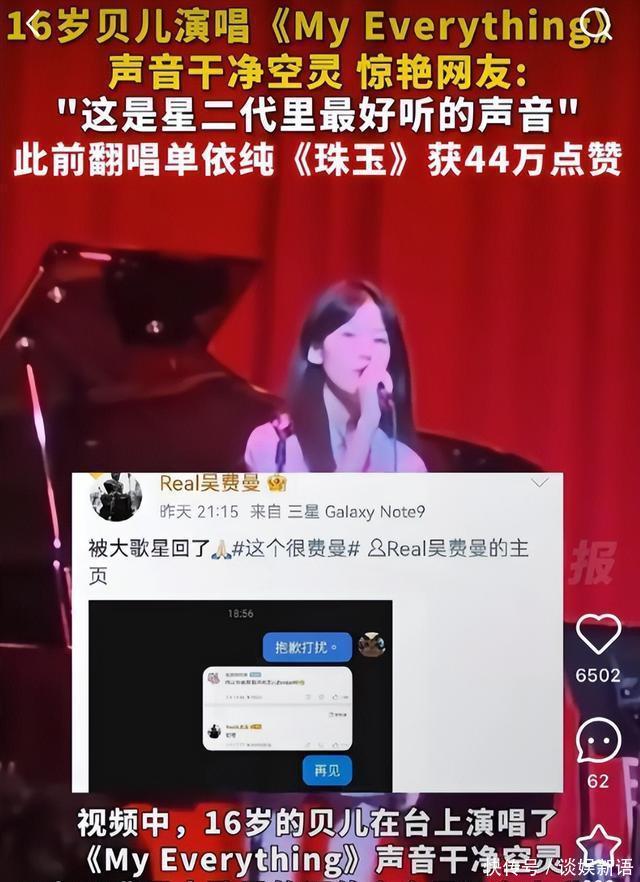 现在的贝儿,就像从校园小说里走出来的女主,172cm的身高搭配大长腿,清秀的五官自带“白月光”滤镜,唱歌时眼里有光,日常里低调内敛。 没有刻意迎合大众期待,也没有被星二代的身份束缚,这样的成长轨迹,或许比颜值身材更让人羡慕。